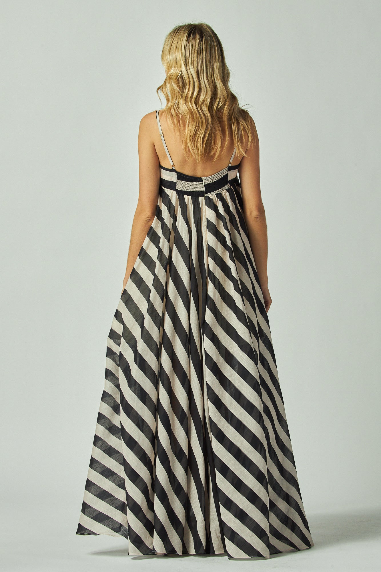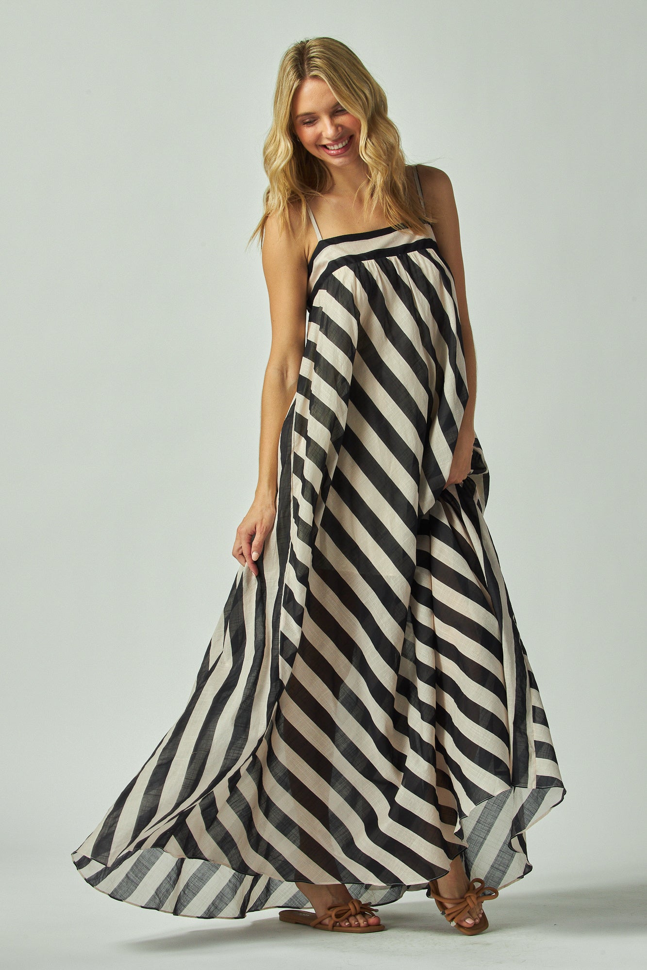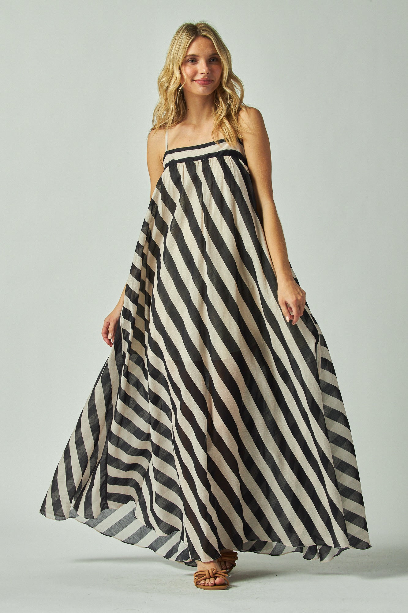 I wore the Evelyn dress with the Gabriella top and the two worked so well together. For reference, I'm 5'4", about 120 lbs with slimmer arms and legs but a fuller upper body. The dress is super light and airy, almost like silk. It has two flowy sheer layers that move with every step, which looks really pretty in pictures and even adds a touch of flirty elegance. The back has a stretchy band, so it adjusts with my body and doesn't press into my sides or underarms when sitting. That detail alone makes it much more comfortable than a lot of fitted dresses I've tried.
